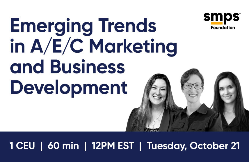 Join SMPS Foundation president, Michele Raftery, FSMPS, CPSM, WELL AP, and SMPS Foundation president-elect for this October Learning Lab. This session will share findings from the SMPS Foundation sponsored report and ideas on how to use these trends to transform business.