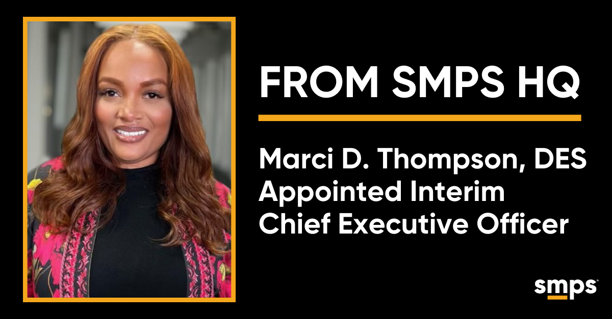 In January 2024, the SMPS board of directors convened for their quarterly meeting and appointed Marci Thompson, DES, as the interim CEO of the Society. Marci brings a wealth of experience and expertise to this role. She initially joined the Society in 2015 as the senior director of education and has since assumed various leadership positions, including VP of knowledge & professional development, chief learning officer, and most recently, chief of strategy & growth.