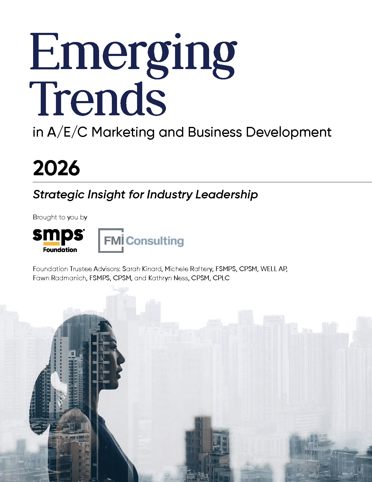 Are you ready to inspire and challenge your firm’s leaders to think ahead? The SMPS Foundation’s Emerging Trends in A/E/C Marketing and Business Development report has been distilled into a ready-to-use presentation with key findings, visuals, and talking points to help you start meaningful conversations about the future of marketing, business development, and client experience in your firm.
